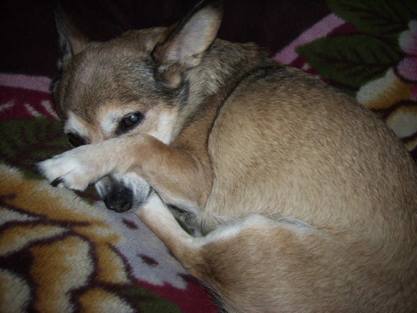 Карликовый пинчер лежит на пледе в сонном состоянии
