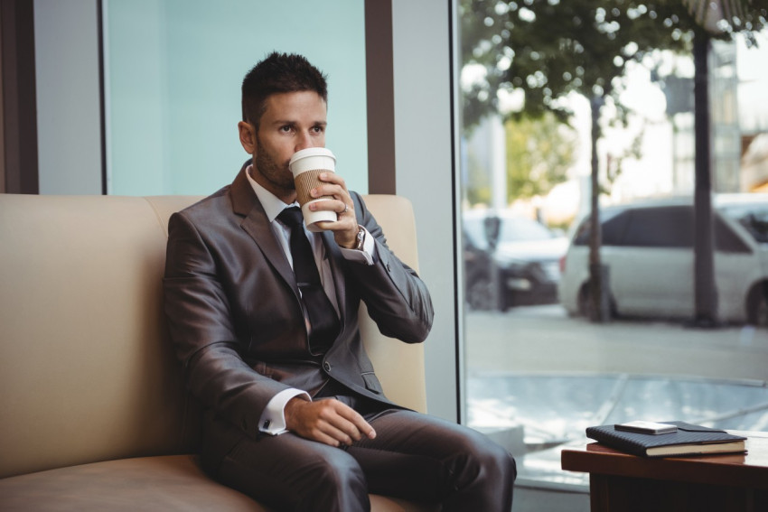 Мужчина в деловом костюме пьет кофе в кафе