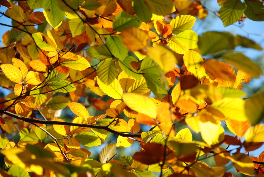Солнечные лучи пробиваются сквозь осеннюю листву дерева