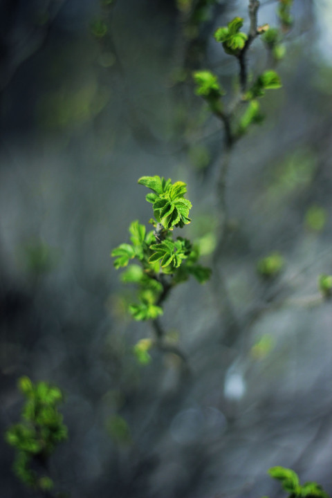 Зеленые молодые листочки в тумане