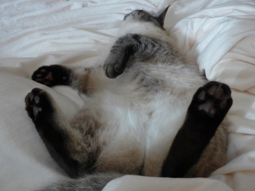 Кот лежит на спине на постели