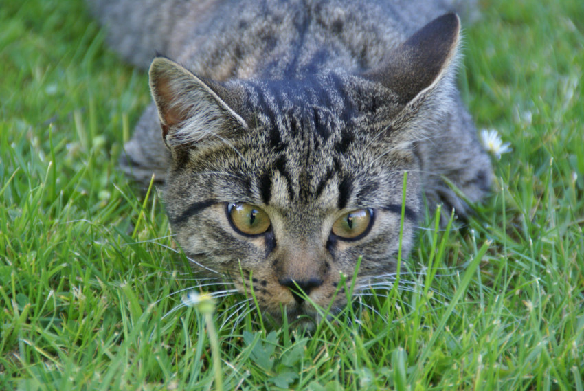 Кошка притаилась в траве