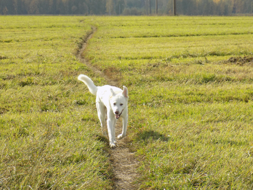 собака движение поле лето жара животное язык трава дорога тропа земля кинолог прогулка любовь романтика спорт белый лапа бегПохожие фото