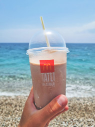 Милкшейк из Макдональдс на фоне моря