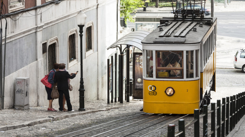 Желтый лиссабонский трамвай поднимается в гору