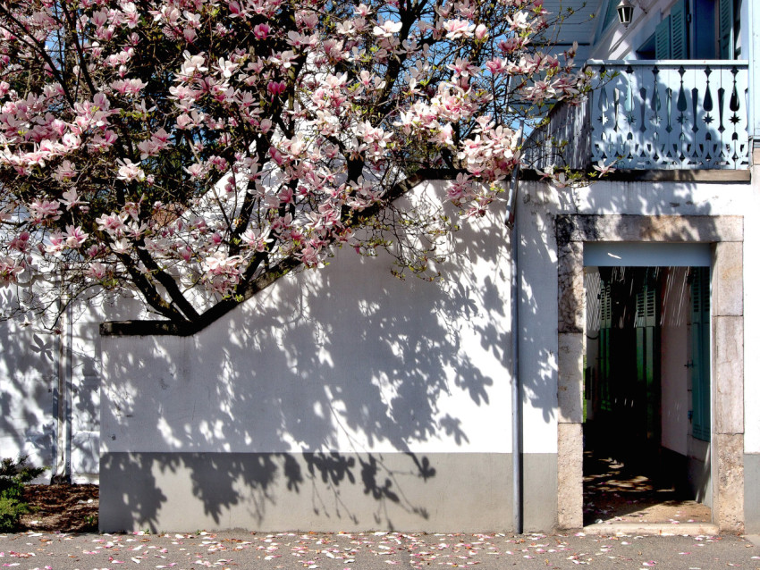 Цветущая магнолия у фасада здания