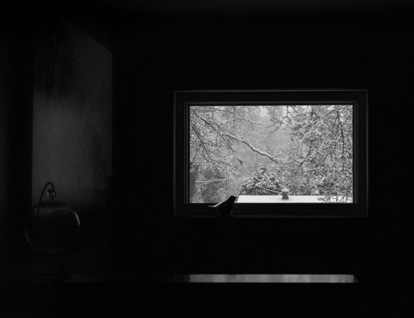 Зимний пейзаж из окна темной комнаты черно-белая фотография