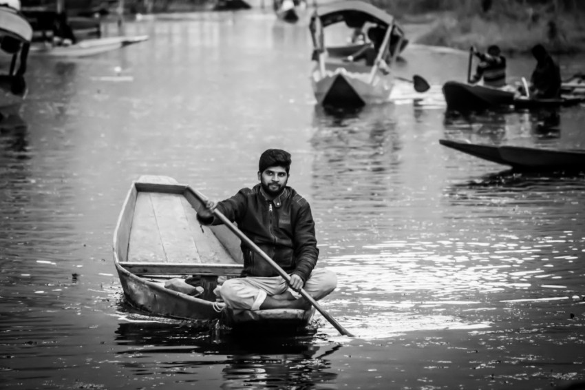 Черно-белое портретное фото мужчины в кафе со смартфоном в руках смотрящего в окно