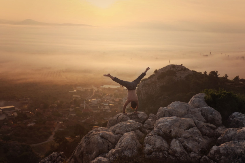 Мужчина стоит на руках на вершине горы