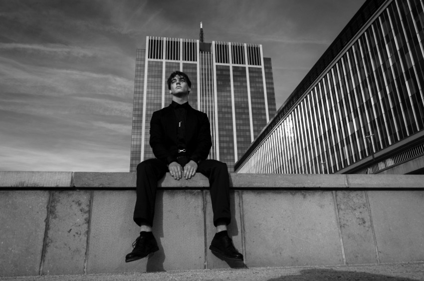 Чернокожий парень в красной шапке с голым торсом на фоне кирпичной стены