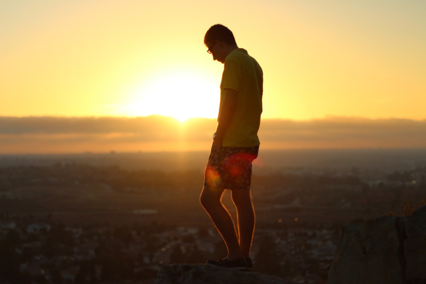 Мужчина в футболке и шортах на закате на скале