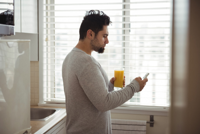 Мужчина утром со стаканом свежевыжатого апельсинового сока в руке и со смартфоном в руке на кухне