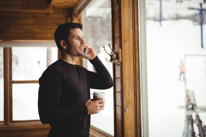 Мужчина со смартфоном и стаканом кофе в руке на горнолыжном курорте