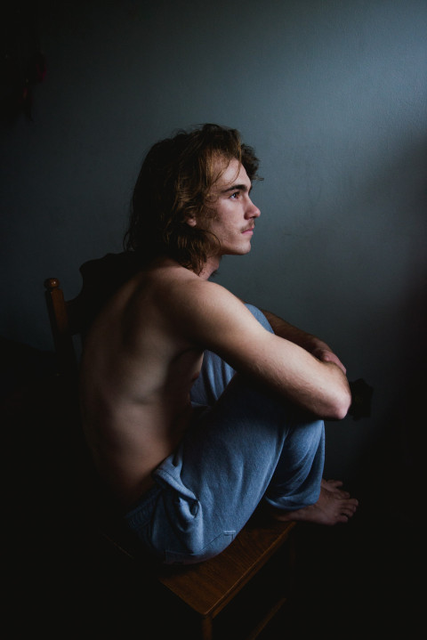 Фотосессия мужчины с голым торсом сидящего на стуле в комнате в полумраке
