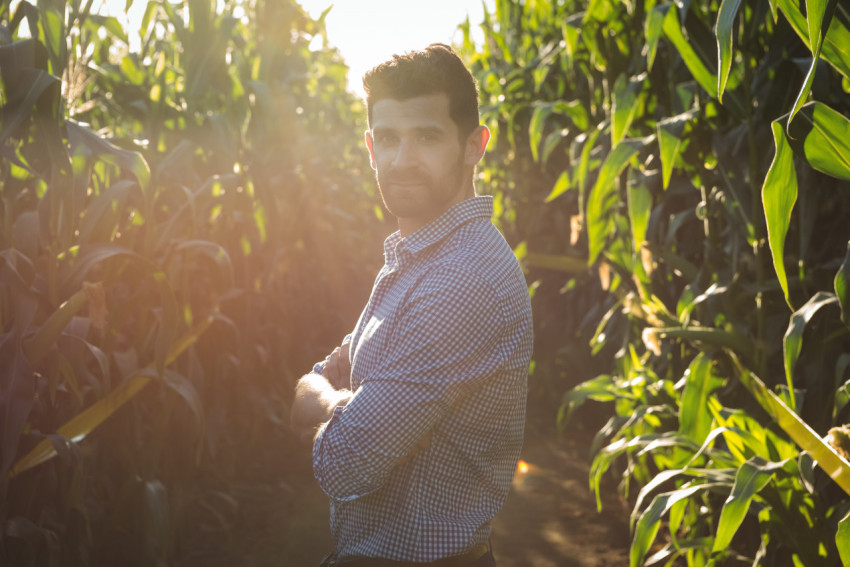Фотограф с кожаной сумкой смотрит в туманную даль