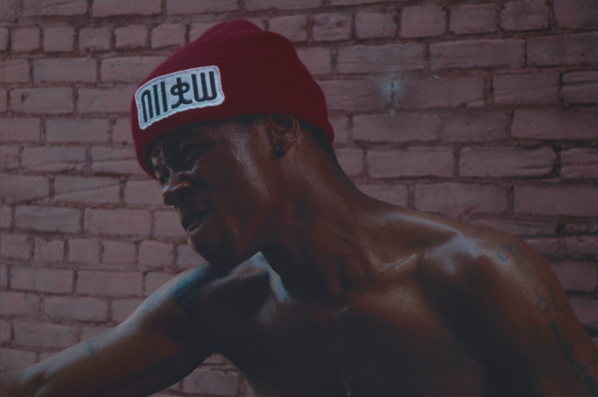 Чернокожий парень в красной шапке с голым торсом на фоне кирпичной стены