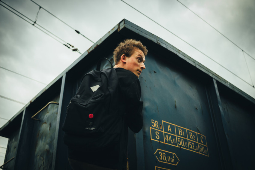 Парень с рюкзаком лезет на грузовой вагон поезда товарняка