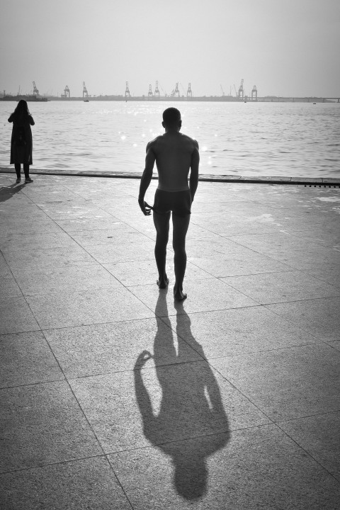 Человек в плавательных трусах на набережной собирается купаться черно-белая фотография