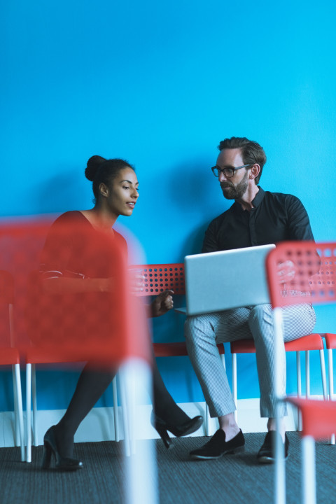 Девушка и мужчина беседуют за ноутбуком на стульях