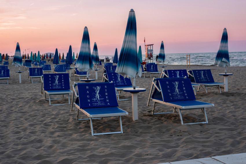 Желтые пляжные зонтики и ораньжевые шезлонги на берегу моря