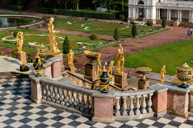 петергоф peterhof парк большие вазы каменные статуи золотой цвет деревья кусты Санкт Петербург Россия Санкт-ПетербургПохожие фото