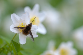 wien schwarzenbergpark wald pflanze buschwindröschen (anemone nemorosa) insekt großer wollschweber (bombylius major)StockPhotoMan