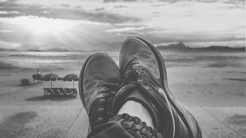 Ноги в кроссовках на фоне пляжа и моря