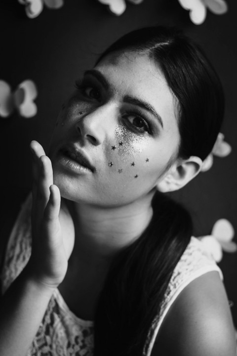 Черно-белое портретное фото девушки с блестками на лице