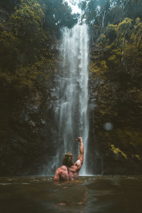 мужчина сила таинственное таинсвенный водопад купается сильный парень со спины перед водопадом люди человек природа путешествиеПохожие фото