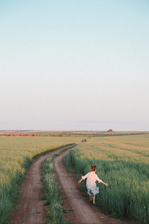 Девушка спиной с легком летнем платье с длинным рукавом и маленьким рюкзачком
