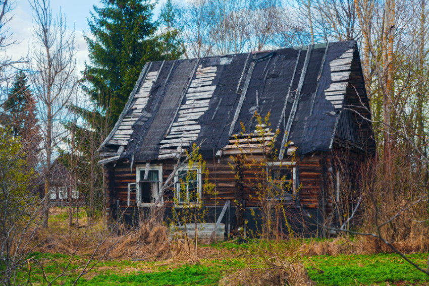 Заброшенная изба в русской глубинке, западная часть России, ранняя весна.