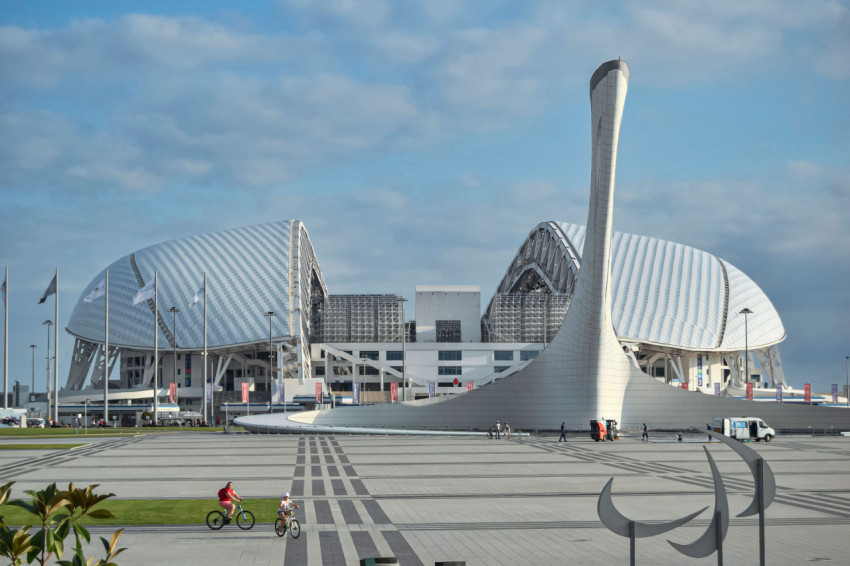 олимпийский парк стадион фишт огромная раздвижная крыша флагштоки люди большая площадь.перед стадионом Сочи Адлер РоссияПохожие фото