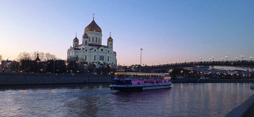 город храм река речной трамвайчик мост сумерки ранняя весна Москва Россия Храм Христа Спасителя соборПохожие фото