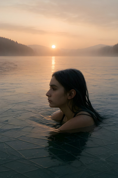 Девушка плавает морозным утром в озере со льдом на поверхности