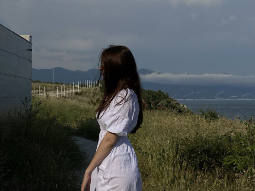 Девушка в белом платице сидит возле дороги в огнях ночной улицы