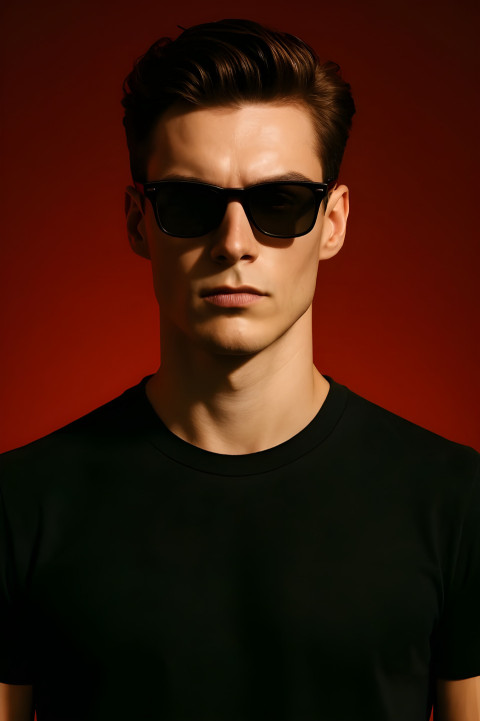 Красивый мужчина в солнцезащитных очках на красном фоне