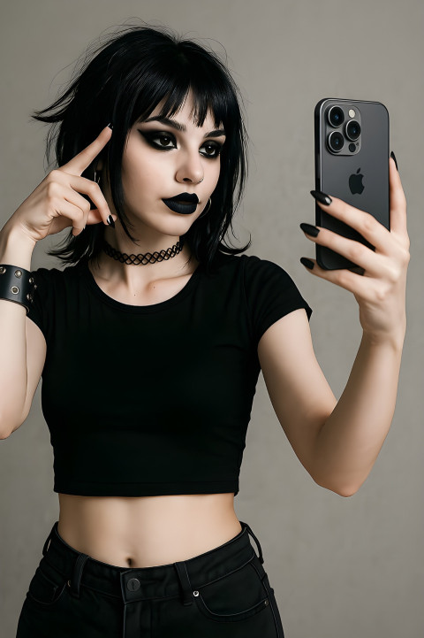 Девушка с черными волосами с iPhone 16 Pro в руке делает селфи