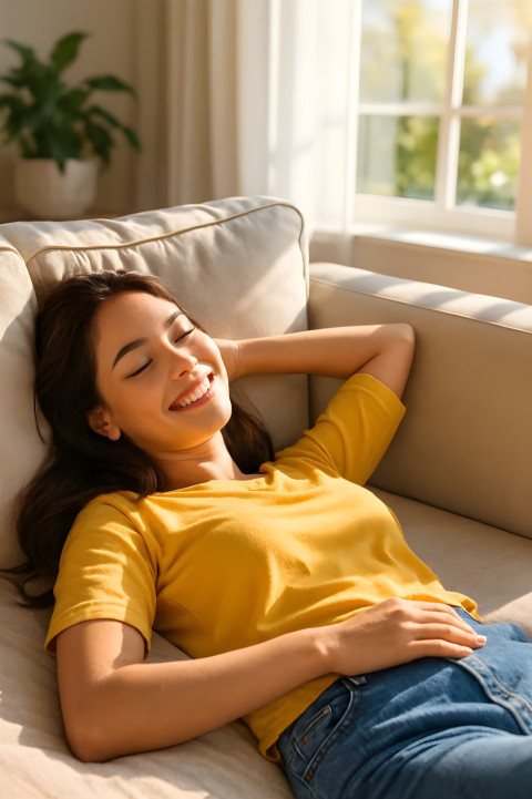 Девушка дома лежит на диване с прикрытыми глазами и улыбается