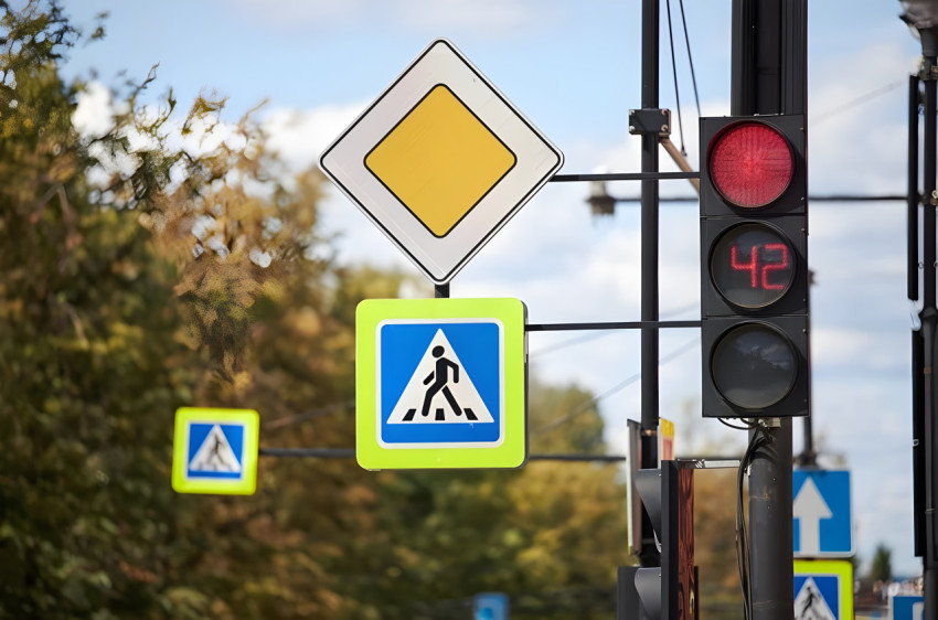 Знаки дорожного движения и светофор на городской улице