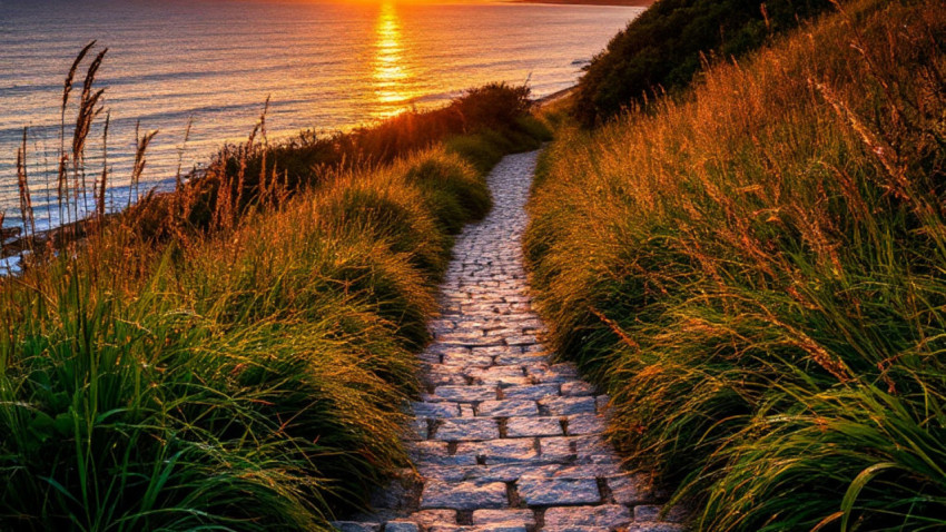 закат море тропа природа пейзаж лето солнечный вет камни путешествие красота вечер тропинка берег трава отдых вдохновение спокойствиеПохожие фото