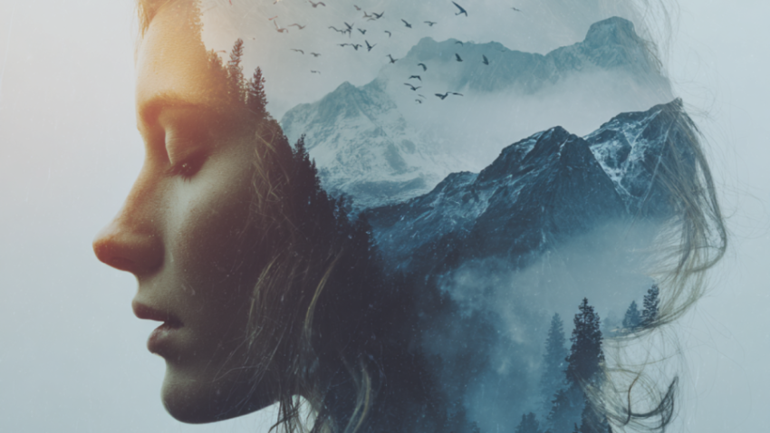 Женское лицо наложено на силуэт гор ИИ изображение