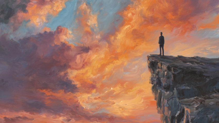 Человек стоит на краю бесконечной скалы ИИ изображение