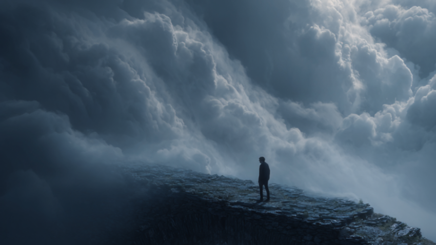 Человек стоит на краю бесконечной скалы ИИ изображение
