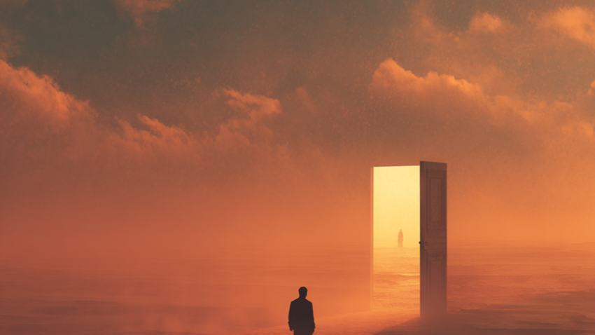 Мужчина стоит перед открытой дверью в небе ИИ изображение