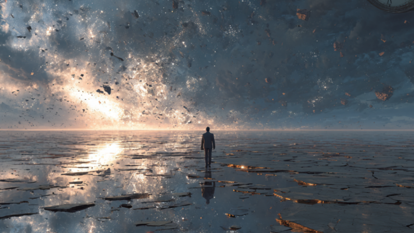 Мужчина стоит перед открытой дверью в небе ИИ изображение