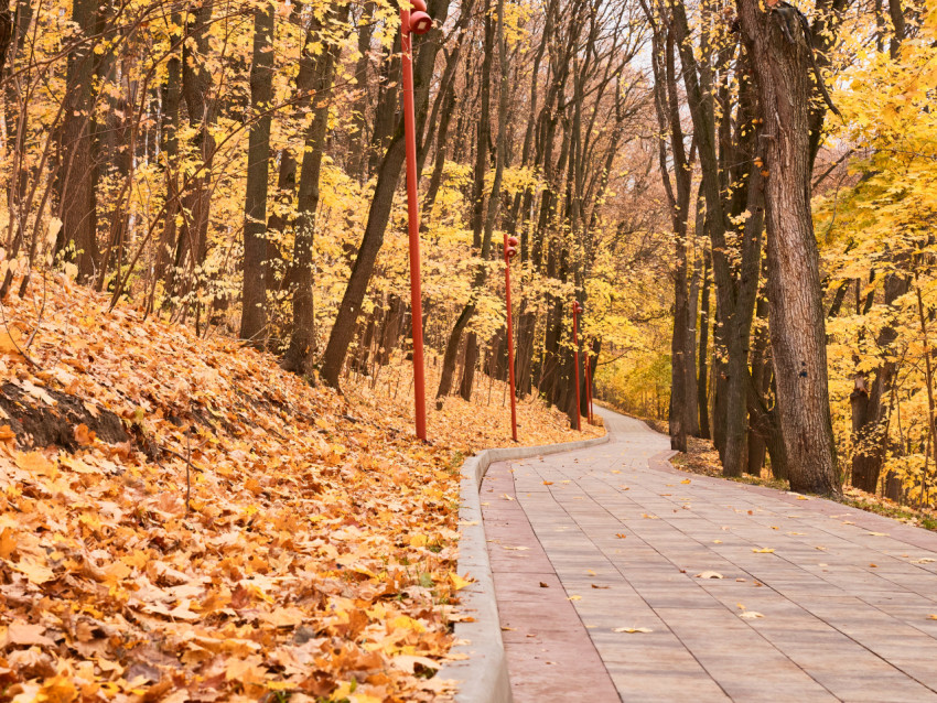 осень парк аллея деревья жёлтые листья прогулка природа тротуар дорожка листва пейзаж сезон тишина спокойствие светильники красота лес уют жёлтый фотопрогулка дорога пенза тропа здоровья город никого без людей пасмурно облачно красный фонарь стволПохожие фото