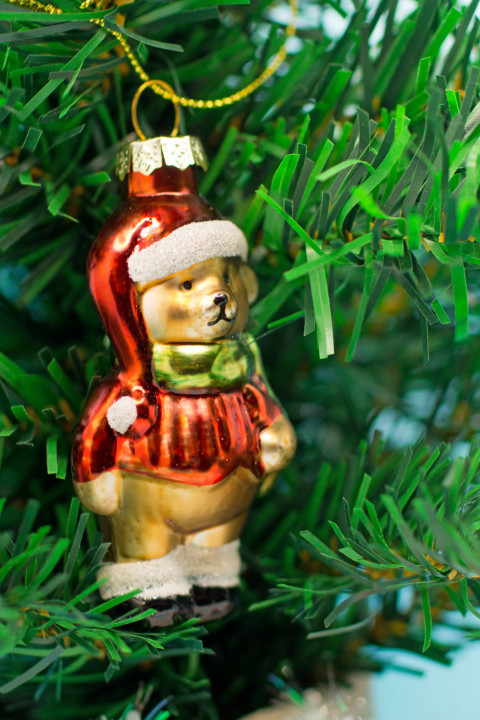Винтажное ёлочное украшение на золотистой верёвочке на ёлке.