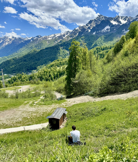 Человек сидит и наслаждается горным пейзажем