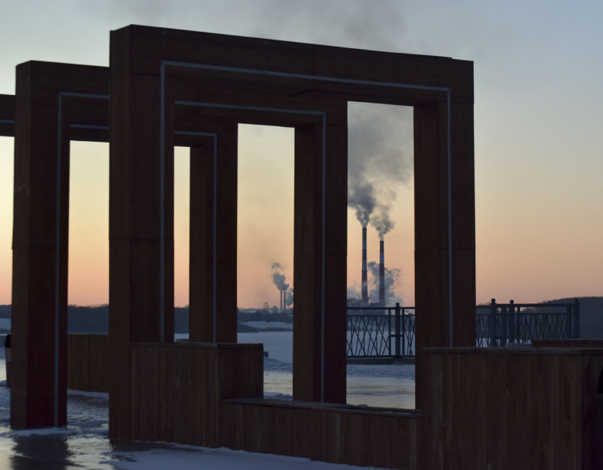закат городская среда притомская набережная кемерово кемеровская грэс артобъект архитектурные арки зима снег промышленные трубы дым из трубПохожие фото