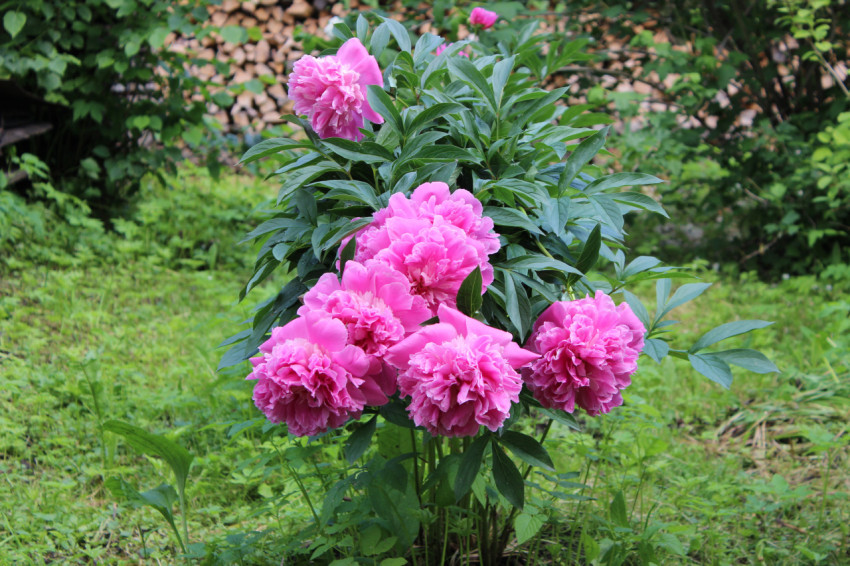 Куст Пиона с розовыми цветами в деревне на фоне поленницы дров